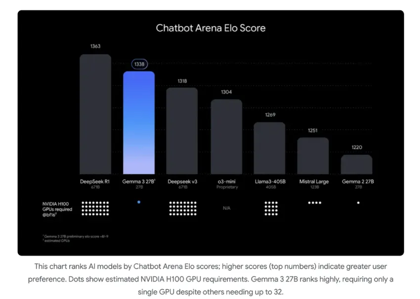 Gemma 3 的早期评估表明,这些模型在其尺寸类别中表现可靠。在一组测试中,27B 变体在相关排行榜上获得了 1338 分,表明它能够在不需要大量硬件资源的情况下提供一致且高质量的响应。基准测试还表明,这些模型能够有效处理文本和视觉数据,这在一定程度上要归功于使用自适应方法管理高分辨率图像的视觉编码器。