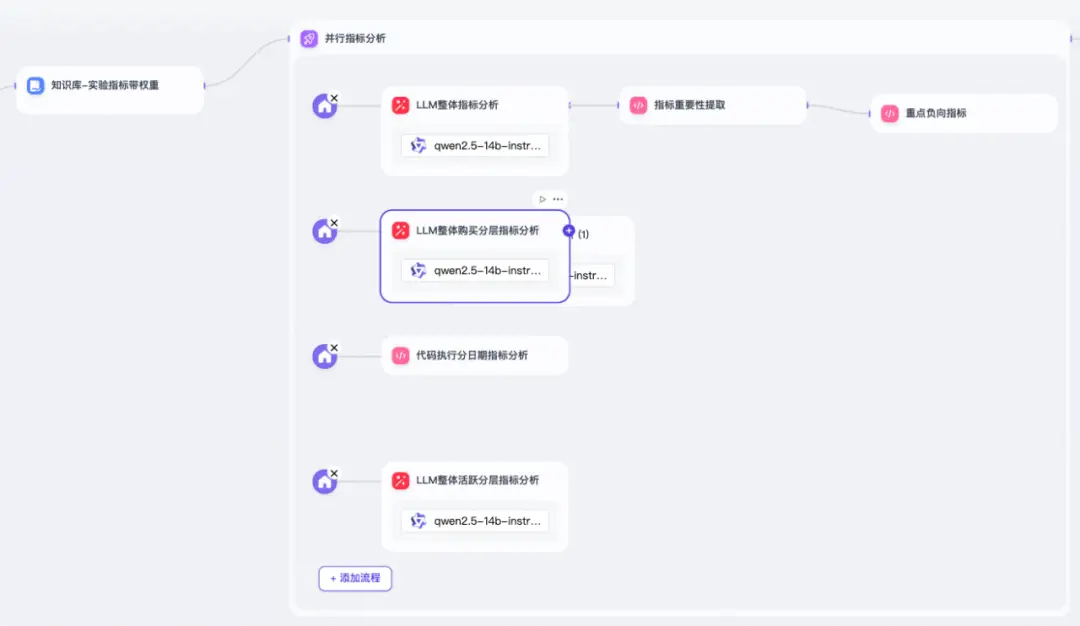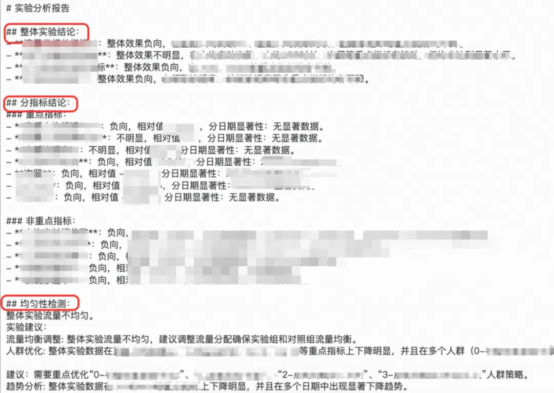 我们在做实验分析的项目中,分析报告会涵盖下面几项比较重要的维度,比如下图所示整体实验结论、分指标结论、非重点指标以及均匀性检测,同时还有最后比较关键的建议或洞察,在这里如果基于实验的相关前置统计数据,一股脑的给到大模型,让它去做几个维度的结论生成,效果会很差,因为我们针对每个维度都会有一些prompt,在这样长序的输入下,大模型非常容易丢失一些context,返回的结果可能只能覆盖部分内容,同时在整体返回时长上也比较久,在这里我们做了任务的拆分,每个维度一个task,然后做了并行的调用编排。