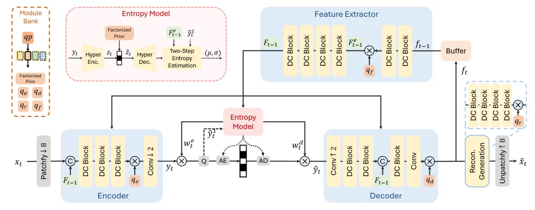 基于这一见解,本文提出了一种新的视角来通过减少操作复杂度来加速NVCs。在此过程中,通过优先将更多的计算能力分配给最关键的模块,同时消除不太重要的模块,来保持模型容量。首先,移除了复杂运动估计和补偿过程,显著减少了组件数量,从而直接降低了操作频率。节省下来的计算能力被重新分配到帧编码模块,以实现更有效的隐式时态建模。此外,提出在单一低分辨率下学习潜在表示,即原始图像大小的1/8。与常用的逐步下采样方法相比,这种方法大大减少了潜在的内存I/O开销,同时促进了更有效的潜在变换,从而提高了率失真复杂度性能。