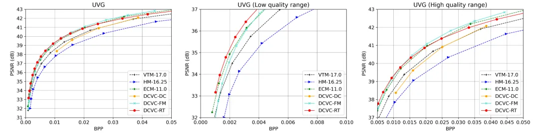 图6展示了UVG的率失真曲线。DCVC-RT在所有质量范围内与VTM相比都表现出更好的性能。特别是在低质量范围(<0.02 bpp)内,DCVC-RT表现出最佳性能。然而,在高质量范围内存在性能下降。这种下降可以归因于DCVC-RT采用的轻量级模型设计,导致模型能力较大型模型有所降低。值得注意的是,这种下降主要发生在40 dB以上,人类视觉在此难以区分不同质量。