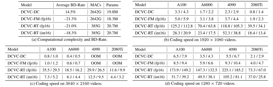 尽管DCVC-RT支持int16模式,但由于int16推理的硬件优化有限,其编码速度仍慢于fp16。在未来,希望这能通过进一步的硬件优化和工程来解决。
