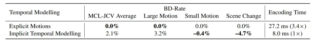 如表1所示,在小运动下,隐式建模将BD-Rate略微提高了0.4%,而在大运动下则显示出3.2%的减少。尽管如此,由于编码时间快了3.4倍,隐式建模在实时应用中更为实用。此外,在场景变化情况下,它超过了显式运动,因为场景变化无法通过运动有效建模。这些结果凸显了其在率失真复杂度权衡中的优势。