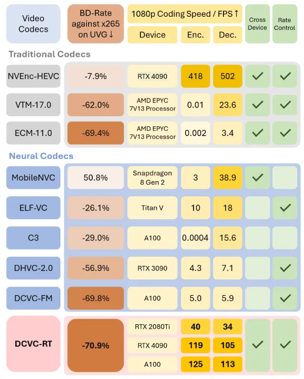 - 据本文所知,DCVC-RT是第一个实现高率失真性能的实时NVC,能够在消费硬件上实现1080p实时编码,与VTM/H.266相比节省了21%的比特率。