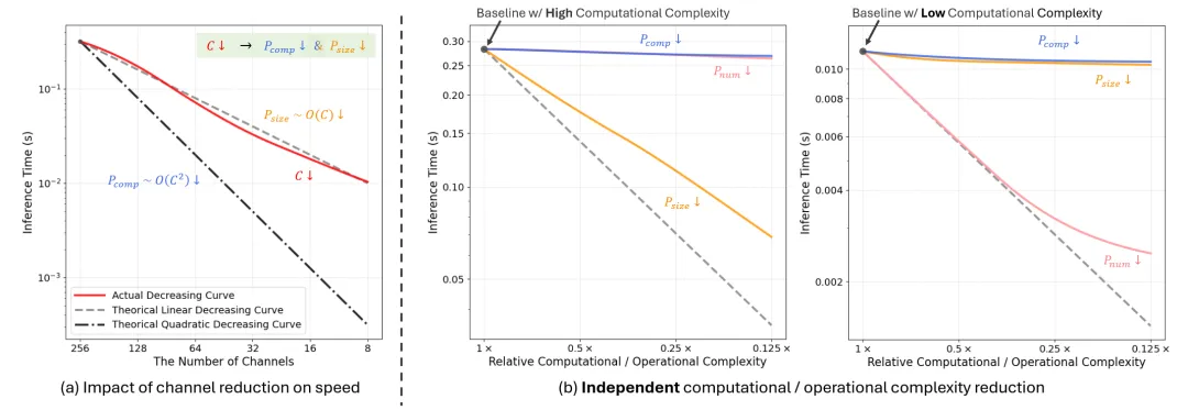 图3(b)的结果揭示了几个关键见解。1)操作复杂度,而非计算复杂度,是主要的速度瓶颈。在不解决操作因素的情况下减少计算成本只会带来边际的推理时间改进。这也解释了为什么减少通道数会导致时间线性而非二次方下降——因为潜在大小随通道数线性减少。2)当计算复杂度高时,潜在表示大小成为主要限制因素。当计算复杂度低时,模块数量成为关键瓶颈。这表明模型的不同部分需要不同的优化策略。