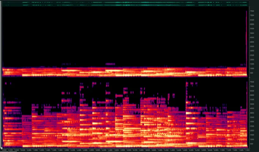 基于深度学习的带宽扩展算法能力更为强大,下图是音乐信号经过带宽扩展前后的频谱对比。原始信号只有1kHz以下的频率成分,而经过扩散模型后可以还原1kHz到8kHz的频率成分。