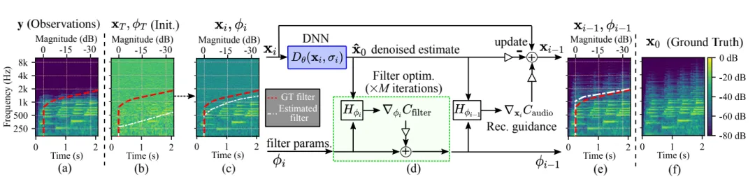 扩散模型(Diffusion Model, DM)在生成类任务中的应用广泛,尤其在图像、音频、文本和3D内容生成等领域取得了突破性的进展。其核心思想是通过逐步添加噪声将数据映射到高斯分布,然后再逐步去噪生成样本。因此将其应用在带宽扩展也是顺理成章的事。基于扩散模型的音频带宽或者推理过程通过反向扩散过程迭代重建缺失的高频频谱(如图b,c,e所示),同时在反向扩散过程中盲估计低通滤波器的失真(白色线叠加显示)。其中d详细展示了一个采样步骤,应用了DNN作为去噪深度神经网络,滤波器参数 ϕi 通过迭代进行优化,音频数据 xi 通过重建引导进行更新。