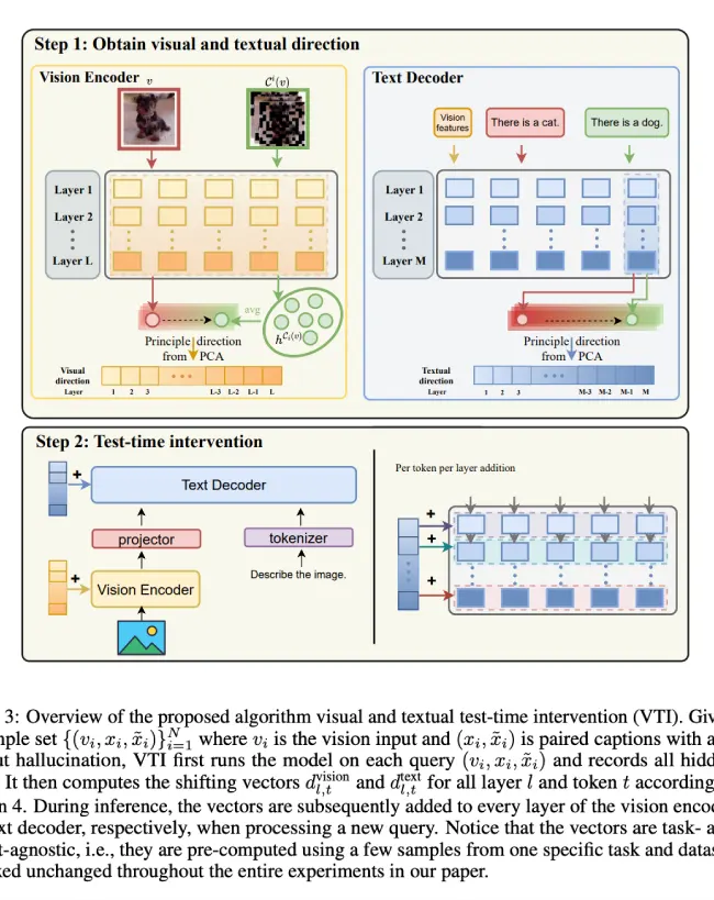 LVLM 包含一个视觉编码器和一个文本解码器,其中不稳定的视觉特征会导致幻觉。研究人员发现,视觉嵌入中的扰动会导致生成的文本不一致。为了解决这个问题,他们提出了 VTI,它使用主成分分析 (PCA) 对受扰动的图像嵌入预先计算稳定的特征偏移。然后将这些偏移应用于新查询,从而无需额外训练即可提高特征稳定性。VTI 还会调整文本解码器嵌入以减少幻觉。实验证实了它在减轻幻觉方面的有效性,同时保持了跨不同任务和数据集的计算效率。