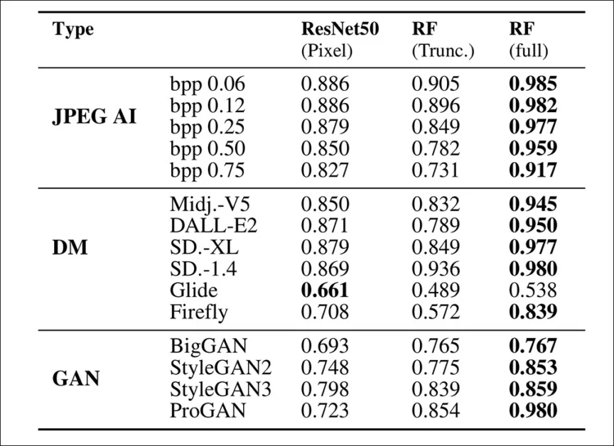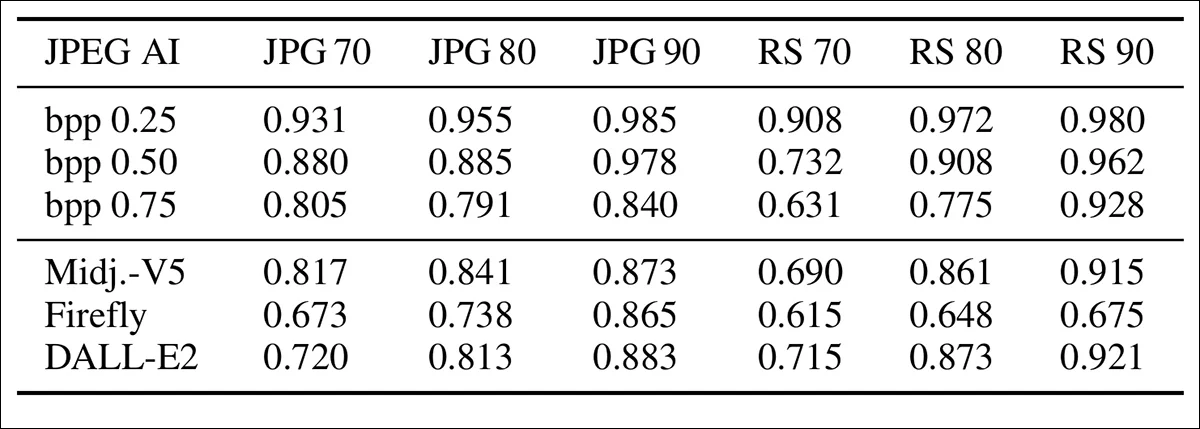 在最后一轮测试中,作者测试了基于量化的特征是否可以区分 JPEG AI 压缩图像和由 Midjourney、Stable Diffusion、DALL-E 2、Glide 和 Adobe Firefly 等模型生成的完全合成图像。
