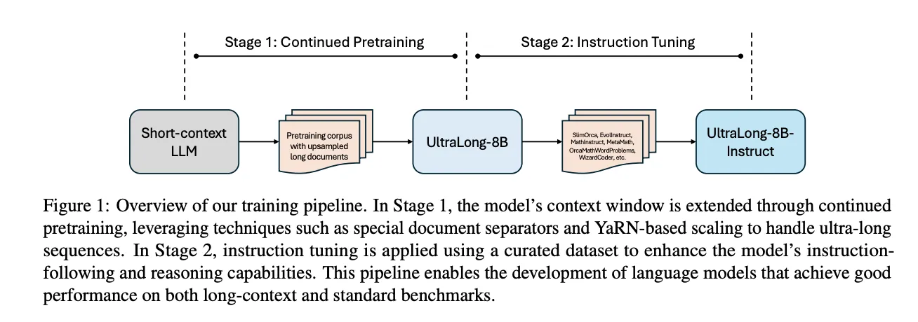 所提出的方法包含两个关键阶段:持续预训练和指令调整。这两个阶段共同作用,能够有效处理超长输入,同时保持跨任务的强大性能。上下文扩展采用基于 YaRN 的缩放方法,其超参数固定为 α = 1 和 β = 4,而非基于 NTK 的缩放策略。缩放因子根据目标上下文长度计算,并对 RoPE 嵌入采用更大的缩放因子,以适应扩展序列并减轻最大长度下的性能下降。研究人员对涵盖通用、数学和代码领域的高质量 SFT 数据集进行子采样以获取训练数据,并进一步利用 GPT-4o 和 GPT-4o-mini 来优化响应并执行严格的数据净化。