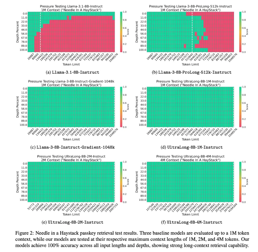 在 Haystack 密码检索测试 Needle 中,所提出的模型展现出卓越的长上下文检索能力。Llama-3-8B-Instruct-Gradient-1048k 等基准模型通过了测试,但 Llama3.1-8B-Instruct 和 Llama-3-8B-ProLong-512k-Instruct 出现了错误。相比之下,UltraLong 模型在所有输入长度和深度上均达到了 100% 的准确率,展现出强大的检索能力。UltraLong 在 RULER 测试中,对于高达 512K 和 1M 个 token 的输入取得了最高平均分数,在 LV-Eval 测试中,对于 128K 和 256K 个 token 长度取得了最高的 F1 分数,并在 InfiniteBench 测试中获得了最佳性能。此外,这些模型在通用、数学和代码领域保持了强劲的性能,平均得分分别为 62.47、61.06 和 60.95,超过了基础模型的 61.45。