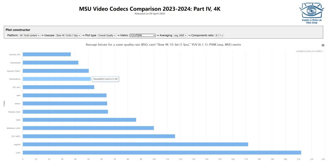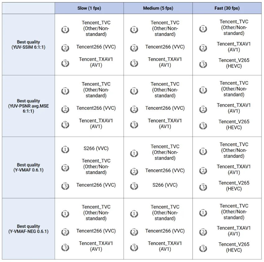 2025年4月14日,由莫斯科国立大学举办的 MSU 4K 视频编码器大赛结果揭晓。在全部参赛编码器中,腾讯编码器获得所有12项指标的11项第一,4K 编码大赛全场最佳。