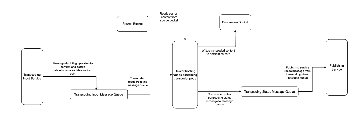 - 一旦给定的转码器 pod 完成请求的操作,它就会通过按照预定义规范将消息写入另一个消息队列(在上图中表示为Transcoding Status Message Queue)来通知操作状态和其他相关详细信息,然后从队列中读取下一条可用消息。
