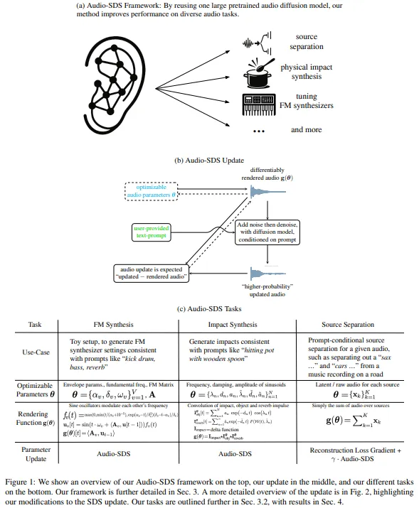 经典音频技术例如调频 (FM) 合成(使用算子调制的振荡器来制作丰富的音色)以及物理接地的撞击声模拟器——提供了紧凑且可解释的参数空间。同样,源分离也已从矩阵分解发展到神经和文本引导的方法,用于分离人声或乐器等成分。通过将 SDS 更新与预训练的音频扩散模型相结合,人们可以利用学习到的生成先验知识,直接从高级提示中指导 FM 参数、撞击声模拟器或分离掩码的优化,从而将信号处理的可解释性与现代基于扩散的生成的灵活性相结合。
