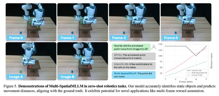 在本文中,研究人员将MLLM的空间理解扩展到多帧场景,填补了先前研究中被忽视的一个关键空白。他们提出了MultiSPA,这是第一个用于多帧空间推理任务的大规模数据集和基准。实验验证表明,所提出的Multi-SpatialMLLM在各种空间理解挑战中均具有有效性、可扩展性和强大的泛化能力。这项研究揭示了重要的见解,包括多任务学习的优势以及复杂空间推理中的涌现行为。该模型建立了新的应用,包括充当多帧奖励注释器。