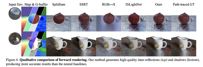 - 前向渲染:在从 G 缓冲区和光照生成图像时,DiffusionRenderer 的表现显著优于其他神经方法,尤其是在复杂的多物体场景中,逼真的相互反射和阴影至关重要。该神经渲染的表现显著优于其他方法。