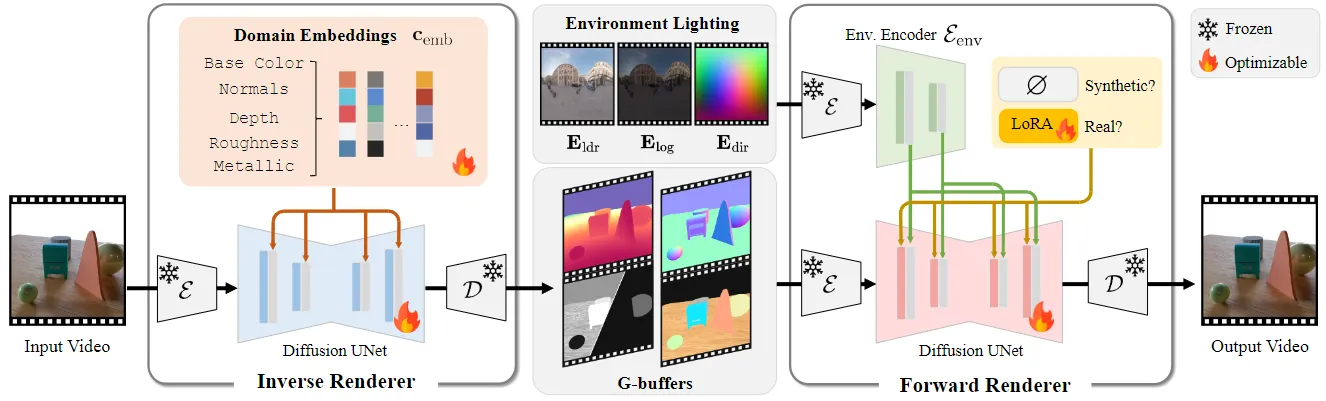 通过使用完美的合成数据和自动标记的真实世界数据对前向渲染器进行联合训练,该模型学会了弥合关键的“领域差距”。它学习了来自合成世界的规则以及现实世界的外观和感觉。为了处理自动标记数据中不可避免的误差,该团队加入了一个 LoRA(低秩自适应)模块,这是一种巧妙的技术,它使模型能够适应噪声更大的真实数据,而不会损害从原始合成数据集中获得的知识。