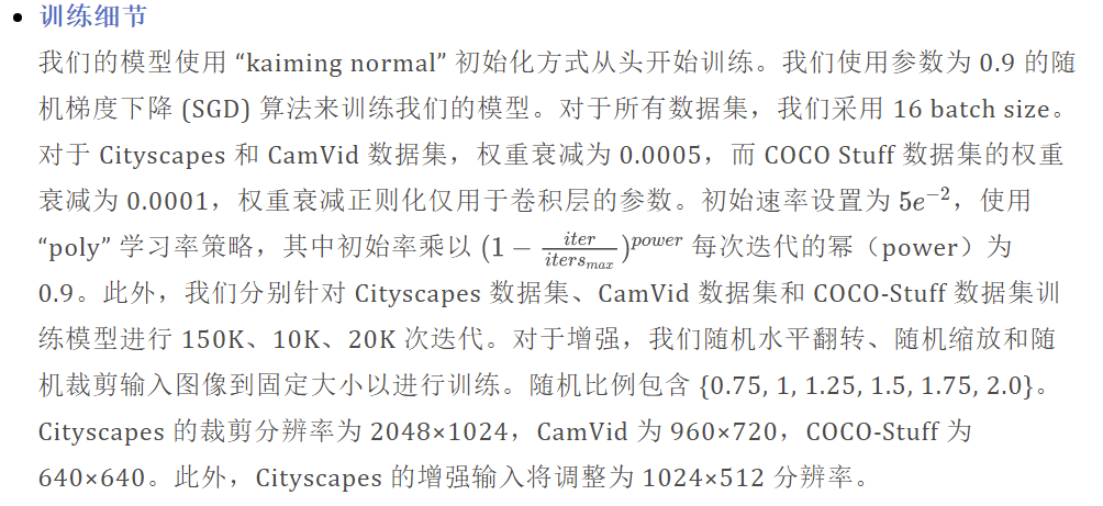 我们没有采用任何评估技巧,例如滑动窗口评估和多尺度测试,这可以提高准确性但很耗时。对于 2048×1024 分辨率的输入,我们首先将其调整为 1024×512 分辨率进行推理,然后将预测调整为输入的原始大小。我们仅用一张 GPU 测量推理时间并重复 5000 次迭代以消除误差波动,调整大小的时间包含在推理时间测量中。我们对 Cityscapes 数据集和 CamVid 数据集采用平均并集交集(mIoU)的标准度量,而对 COCO Stuff 数据集采用 mIoU 和像素精度(pixAcc)。