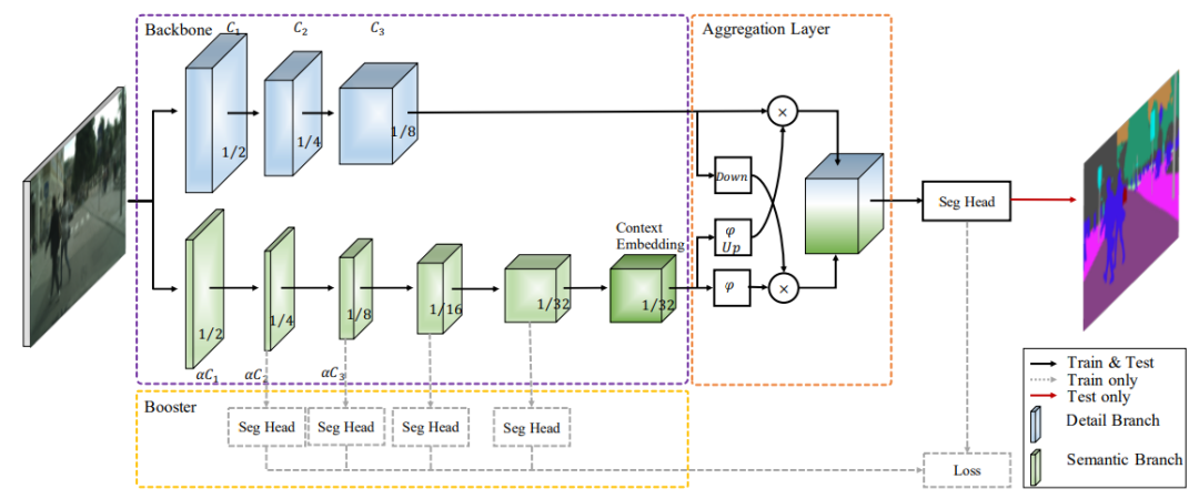 为了进一步提高分割精度,我们提出了一种助推器训练策略。顾名思义,它类似于火箭助推器:它可以在训练阶段增强特征表示,在推理阶段丢弃。因此,它在推理阶段增加的计算复杂度很小。我们可以将辅助分割头插入到语义分支的不同位置。