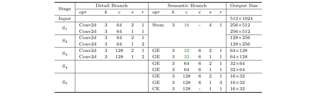 每个阶段(S)包括一层或多层网络结构(例如Conv2d,Stem,GE,CE),每个网络结构有对应的核大小(k)、步长(s)、输出通道数(c)和重复次数(r),在语义分支中还有扩展参数e来控制每次操作对通道数的扩展。
