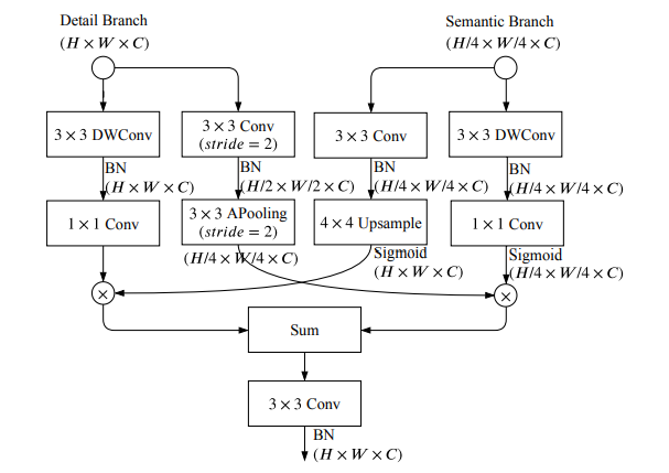 上图是用于两个分支特征融合的引导聚合层(GAL)的结构示意图,其中 DWConv表示 depth-wise convolution,APooling 是平均池化,BN 代表 batch normalization。