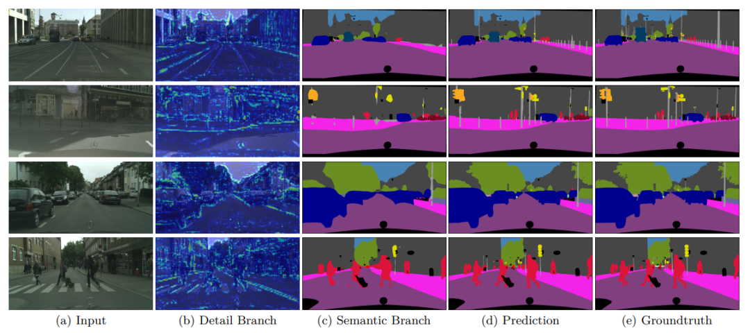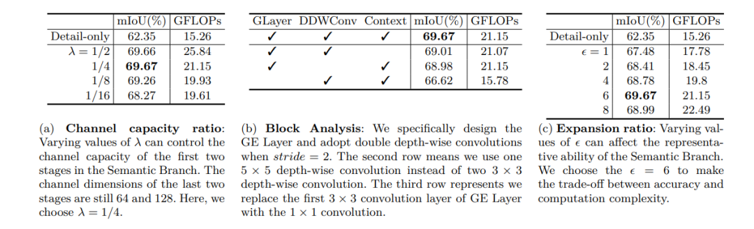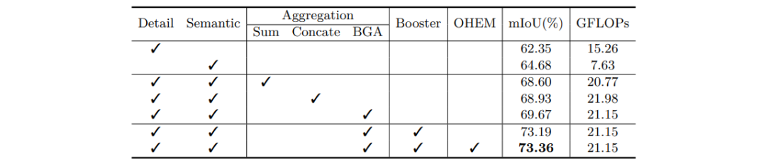 此外,本文还在 Cityscapes 数据集中对细节分支的参数选择及网络结构中的一些模块做了消融实验,其结果如上表所示。从实验数据可知本文提出的结构在准确度和复杂度上做到了较好的平衡。
