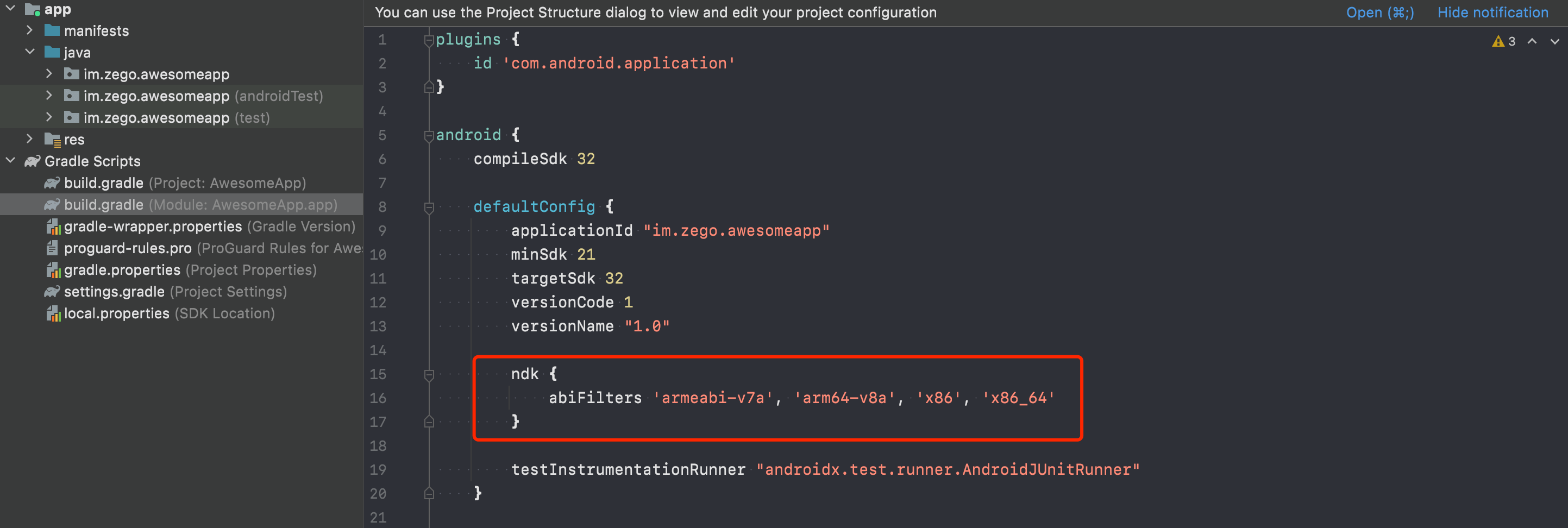 - 在 “defaultConfig” 节点添加 “ndk” 节点,指定支持的架构。