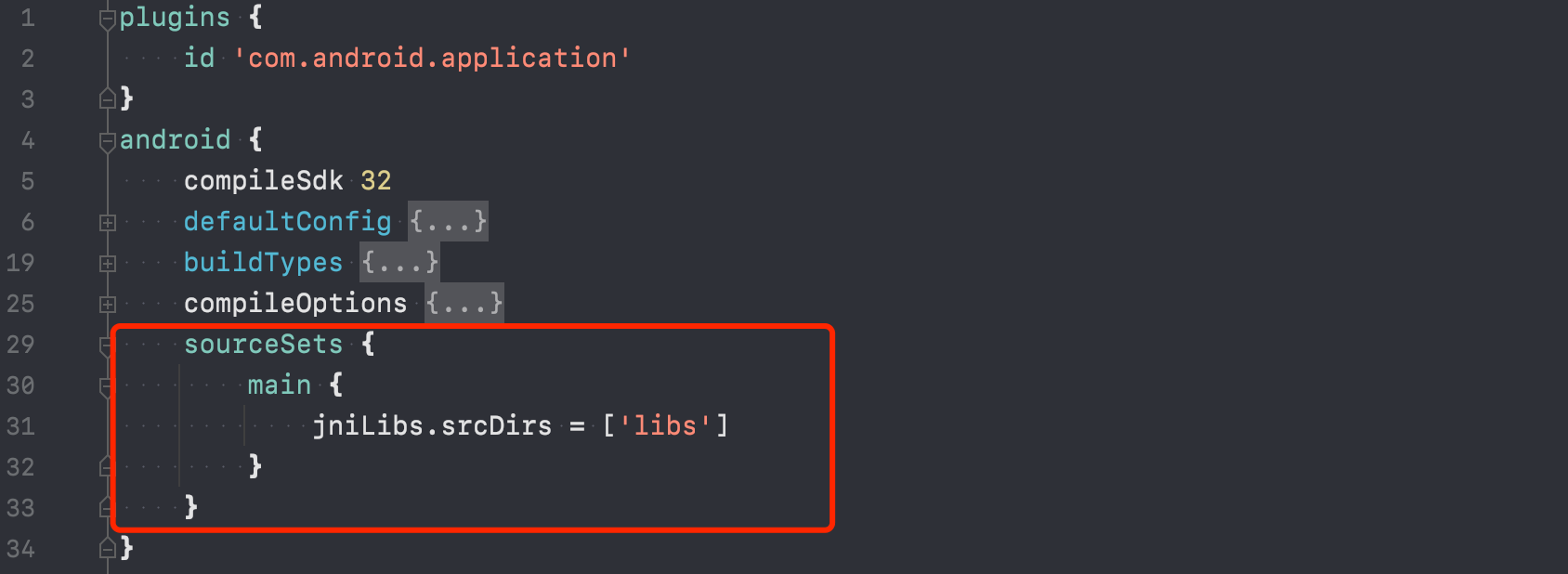 在 “android” 节点添加 “sourceSets” 节点,指定 “libs” 所在目录。 示例代码中 “libs” 目录仅为举例,开发者可根据实际路径填写。