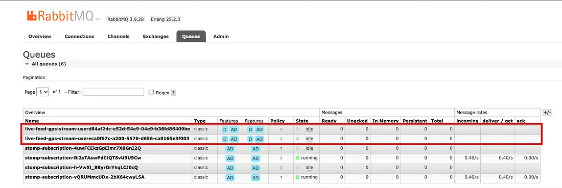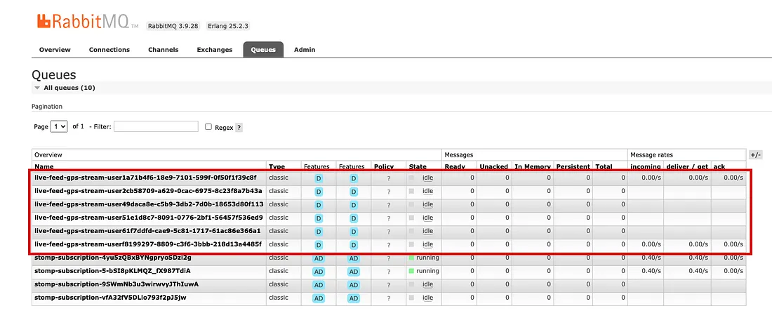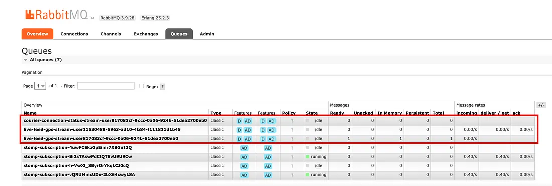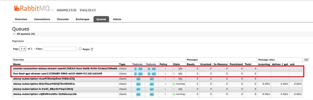 当存在不同的 WebSocket 队列时,会出现另一个问题。当用户同时连接到不同队列时,RabbitMQ 会为每个用户创建单独的队列。在 WebSocket 服务中,当消息到达队列时,Spring 会根据用户的会话 ID (UUID) 将该消息路由到用户。让我们以 live-feed-gps-stream 队列和 courier-connection-status-stream 队列为例进行说明。当用户连接到这两个队列时,会生成不同的 UUID,如 817083cf-9ccc-0a06-924b-51dea2700eb0 和 11530489-5963-ad10-4b84-f111811d1b45。如果有消息发送到 live-feed-gps-stream 队列,则会为另一个队列创建一个单独的 RabbitMQ 队列,其 UUID 为 817083cf-9ccc-0a06-924b-51dea2700eb0,并在该队列中累积消息。
