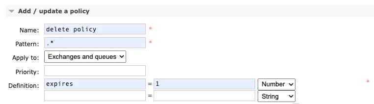即使 RabbitMQ 队列被定义为自动删除(AD),当队列中有消息且连接丢失时,它们也不会自动关闭。为了解决这个问题,我们通过在 RabbitMQ 中定义策略(管理 > 策略)找到了解决方法。通过以下策略,我们确保在连接丢失时保持打开状态的队列也被关闭: