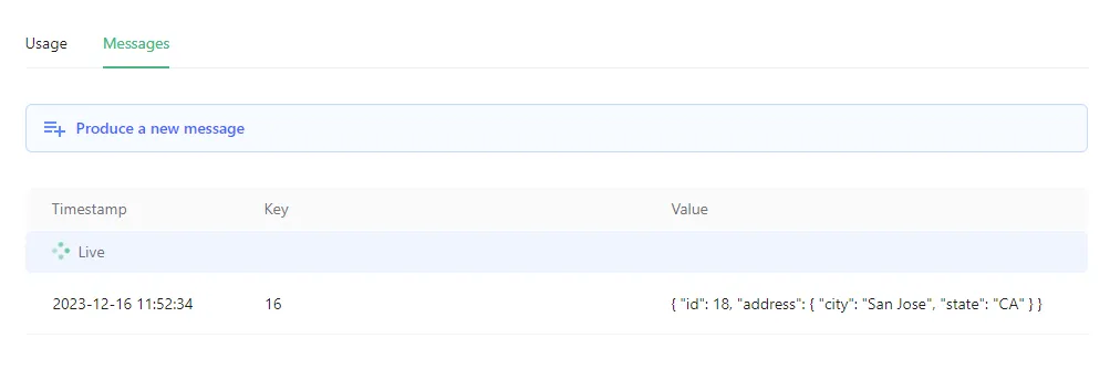 响应成功后,点击主题名称,然后点击消息选项卡,就能在 Upstash UI 上看到生成的消息。