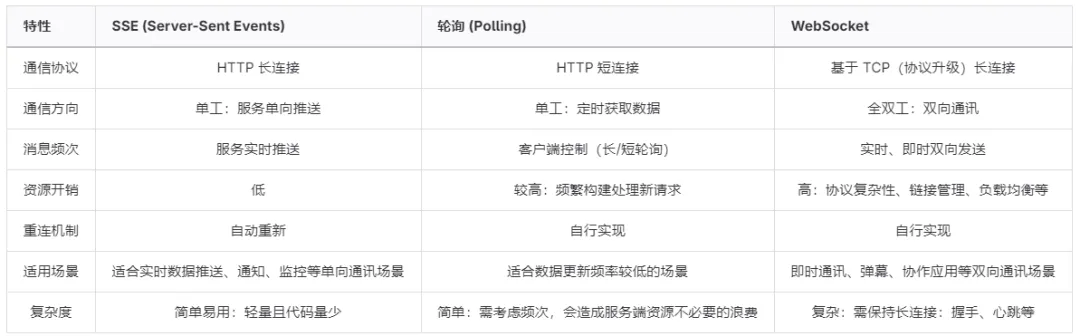 目前市面上很多服务端推送的技术解决方案:SSE、轮询/串行、Websocket 等,我们从易用性,资源开销,使用场景等多维度对比了几个使用较多的主流方案,最终选择了 SSE。