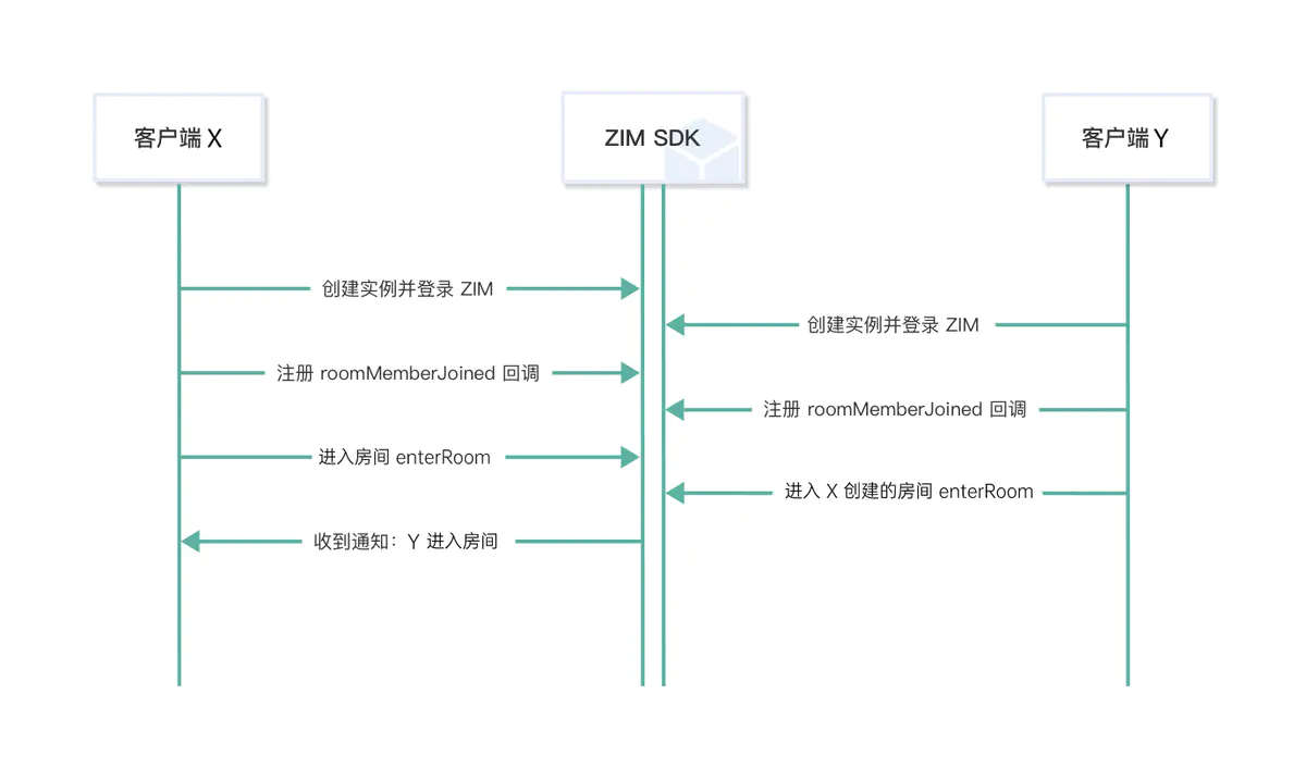 以下流程中,我们以客户端 X 创建并进入房间,客户端 Y 和其他客户端直接进入房间为例。