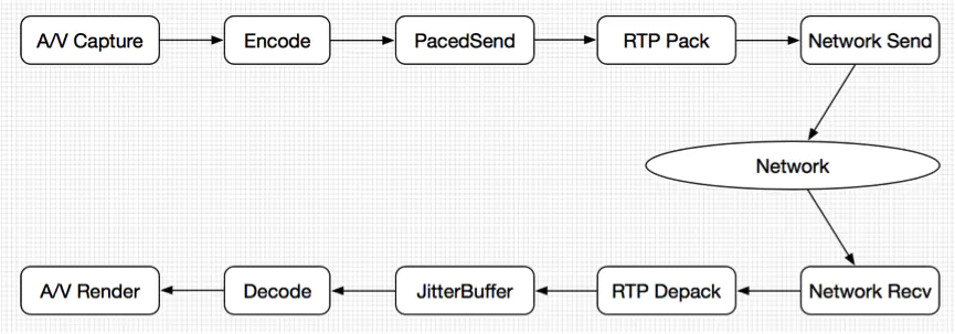 音视频数据首先从采集端进行采集,一般来说音频数据来自麦克风,视频数据来自摄像头。在某些应用场景下,音频数据来自扬声器,视频数据来自桌面共享。采集端的输出是音视频Raw Data。然后Raw Data到达编码模块,数据被编码器编码成符合语法规则的NAL单元,到达发送端缓冲区PacedSender处。接下来PacedSender把NAL单元发送到RTP模块打包为RTP数据包,最后经过网络模块发送到网络。