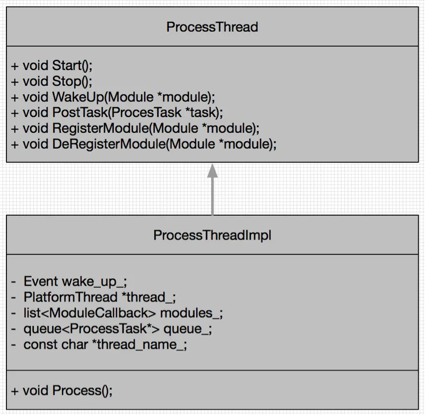 ProcessThread基类提供一系列API完成线程功能:Start()/Stop()函数用来启动和结束线程;WakeUp()函数用来唤醒挂载在本线程下的某个模块,使得该模块有机会马上执行其Process()处理函数;PostTask()函数用来邮递一个任务给本线程;RegisterModule()和DeRegisterModule()用来向线程注册/注销模块。