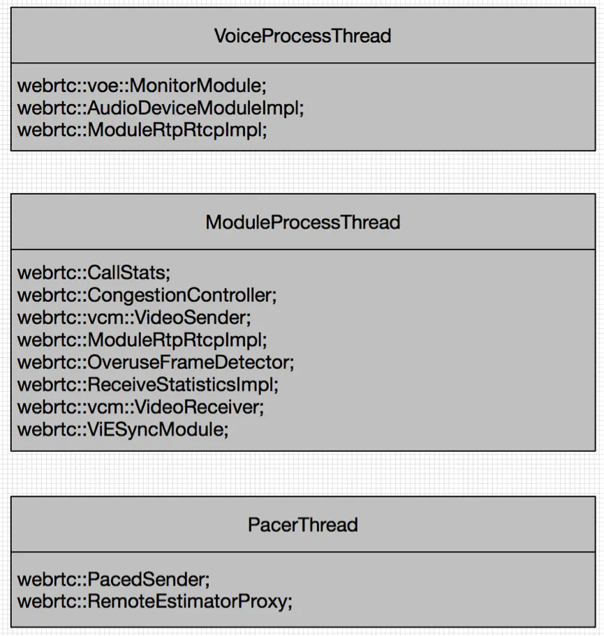 WebRTC目前创建三个ProcessThreadImpl线程实例,分别是负责处理音频的VoiceProcessTread,负责处理视频和音视频同步的ModuleProcessThread,以及负责数据平滑发送的PacerThread。这三个线程和挂载在线程下的模块如图4所示。