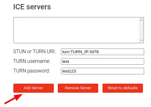 现在开始在浏览器中打开网站并将您的 TURN 服务器信息添加到输入表单中。格式如下所示: