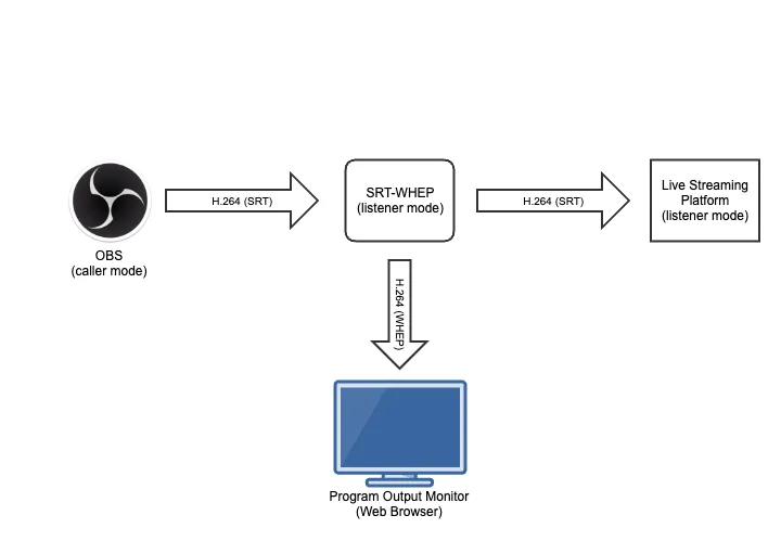 在此示例中,我们在调用者模式(默认)下使用 OBS 和 SRT 输出,并在侦听器模式下运行 srt-whep 应用程序。