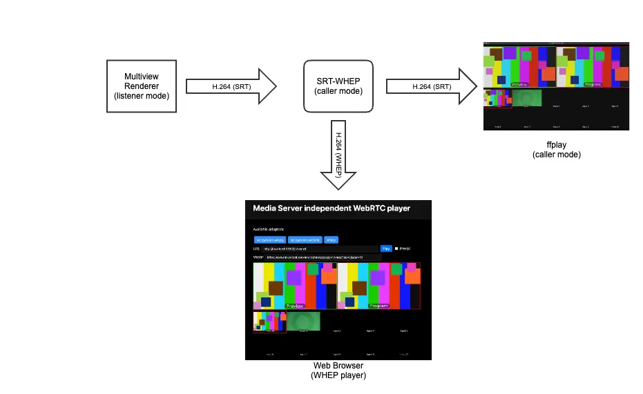 另一个用例是在标准 Web 浏览器和标准 WHEP Web 播放器中显示通过 SRT 渲染和传输的多视图/马赛克。