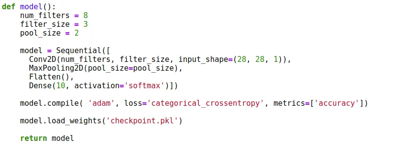 我们将定义模型架构并加载训练好的模型权重,我建议这是加载 TensorFlow 模型的最佳方式,否则权重会被随机化。请不要从模型来判断我的人工智能技能。我在这里开发了一个非常简单的模型,因为人工智能模型不是本文的重点。