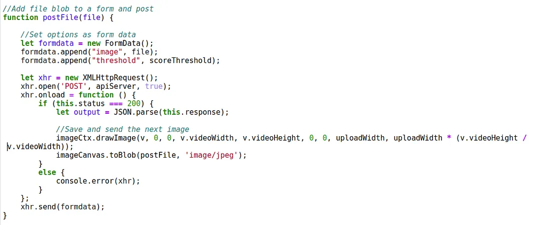 现在我们将编写一个函数 postFile,它将递归调用我们的 python API 并将帧发送到该 API。