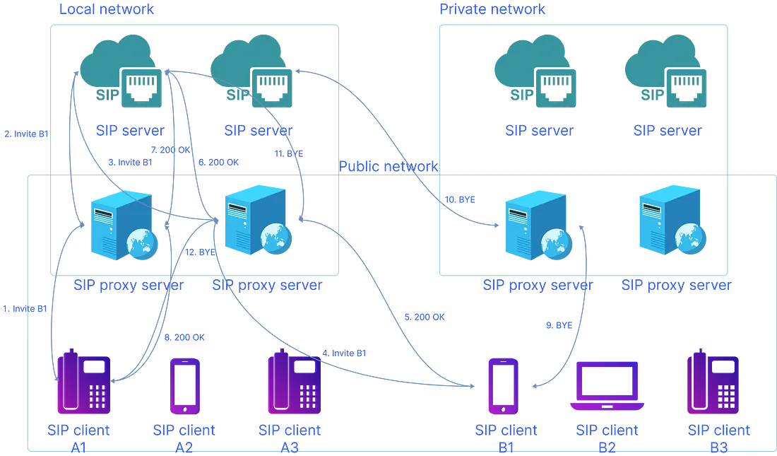大多数情况下,您希望在组织的本地网络内设置 SIP 服务器,而不是将其公开访问。在这种情况下,你很可能希望从网络外的客户端拨打电话。有一种方法可以实现这一目的,即在企业内部网络中建立 SIP 代理服务器,也可以由第三方运营商托管。一般来说,SIP 代理服务器(SPS)有两种主要类型