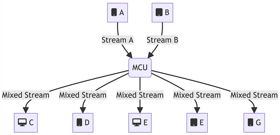 与会者连接到媒体服务器,该服务器负责接收、处理(混音、录制、排版)媒体流,并在与会者之间分发媒体流。MCU 基础设施非常适合以下情况:有许多与会者(15 人以上)的大型会议或网络研讨会;需要流录制、内容混合或复杂布局等高级功能的应用;与会者端网络条件不可靠或不稳定的情况。