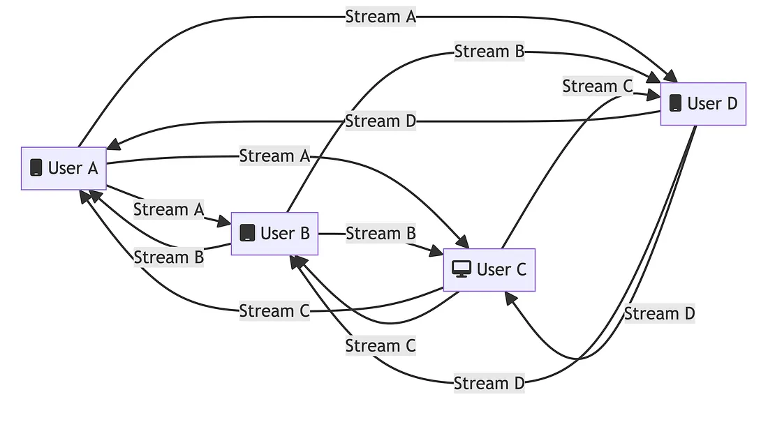 不过,我们必须明白,虽然 WebRTC 很容易设置,而且非常适合小规模通信使用(1-4 个参与者),但一旦规模扩大,它就会变得复杂。WebRTC 技术的设计目的是在没有中间服务器的情况下实现点对点连接,因此它本身无法处理大量受众。要在超过少数设备上扩展体验,它需要后台基础设施。有几种不同的方法可以实现 WebRTC 的可扩展后端。