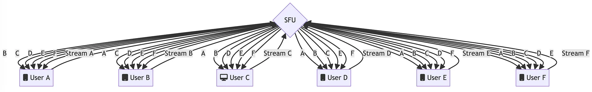 - 可扩展性:SFU 充当中心枢纽,将媒体流转发给连接的参与者,因此可扩展至更大的群组。