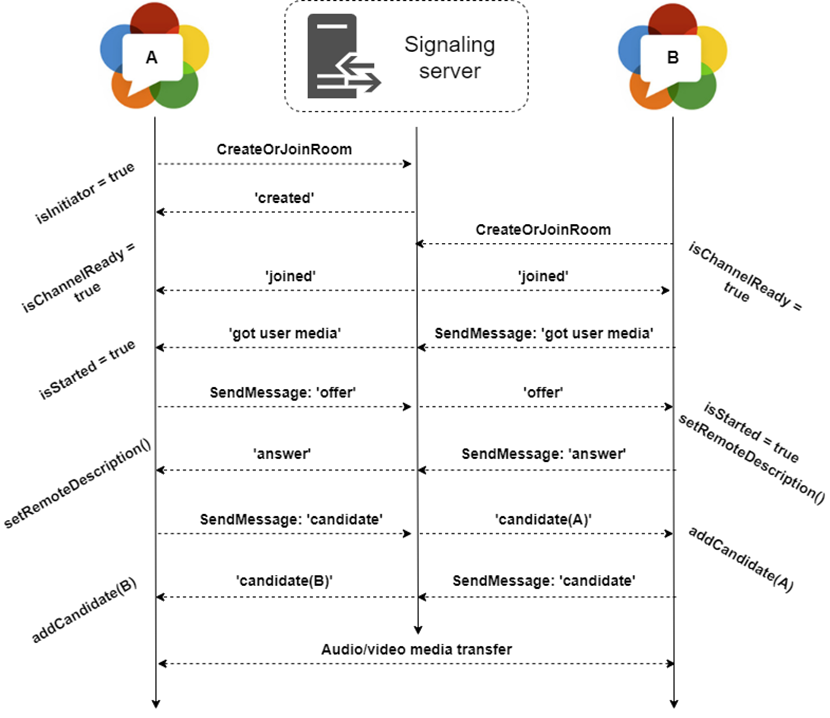 如图所示,它由一些信令服务器方法/端点(例如“ CreateOrJoinRoom ”)组成,客户端必须调用这些方法/端点才能与服务器进行通信,以及一些信令消息(例如“ created ”)将确保每个客户端始终处于正确的信号状态。此外,该图像还显示了 WebRTC 进程正常工作所需的几个 Web 客户端本地标志和方法(例如“ isInitiator ”和“ setRemoteDescription() ”)。这些步骤按时间顺序从上到下进行,每一步完成后,媒体传输就应该开始了。