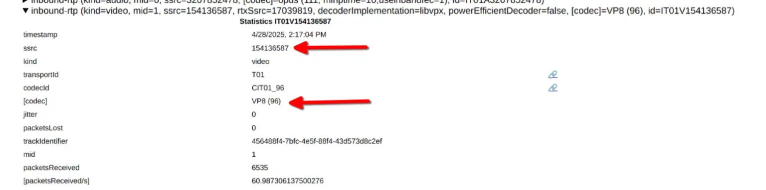 接下来,识别已接收视频流的统计数据。它的名称可能类似于inbound-rtp和kind=video。展开这些值并记下 SSRC、编解码器和有效载荷类型的值,在本例中分别为154136587、VP8和96。