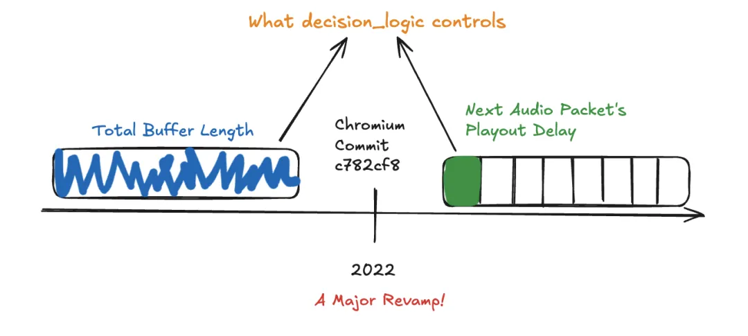 在当今的 WebRTC NetEQ 实现中,decision_logic使用类似于相对延迟的函数来控制 当前播放延迟,这代表单个数据包的延迟。然而,在 2022 年之前,NetEQ 一直通过控制 总缓冲区长度来维护抖动缓冲延迟。