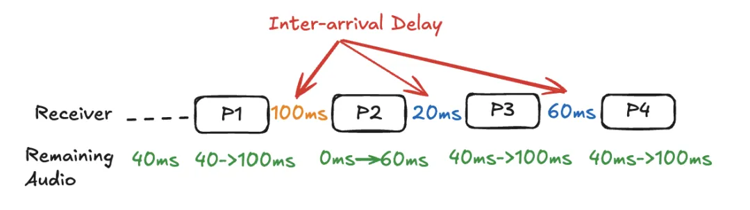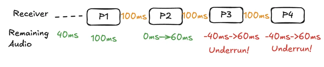 在 P3到达之前,缓冲区缺少 40 毫秒的音频;在 P4到达之前,抖动缓冲区再次缺少 40 毫秒的音频,这也被称为抖动缓冲区欠载。