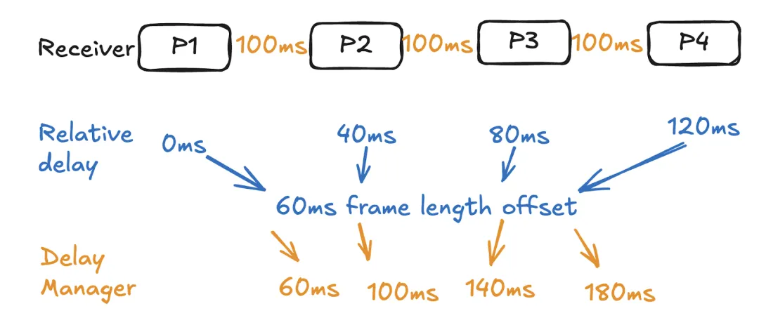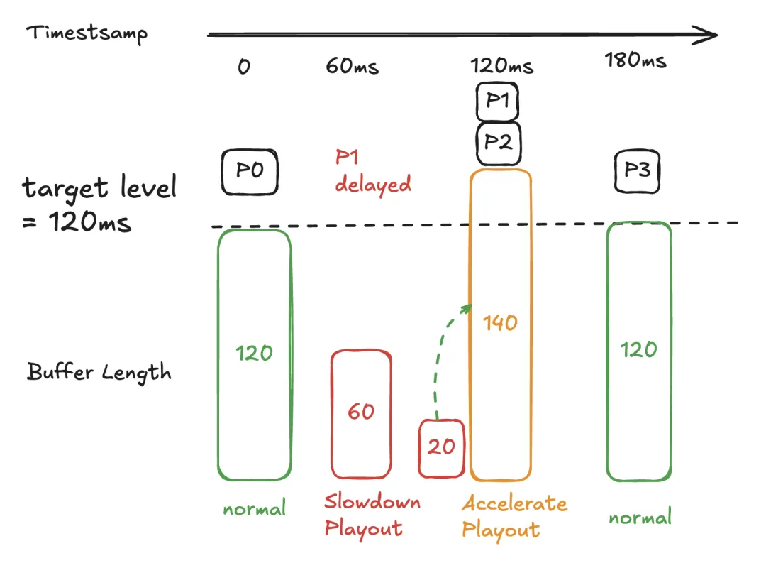 在下面的例子中,在 60 毫秒的时间标记处,下一个数据包是 P0,其延迟正好与目标延迟相同。因此,P0被正常解码和播放;P1、P2和 P3也是如此。这比 “先减速,再加速” 更高效。