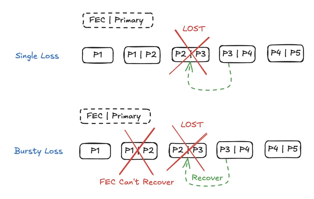 WebRTC 原生支持 Opus 带内 FEC、RED 和 NACK(重传)。带外 FEC——即在 Opus 内置编码机制之外发送冗余音频——由开发者自行实现。